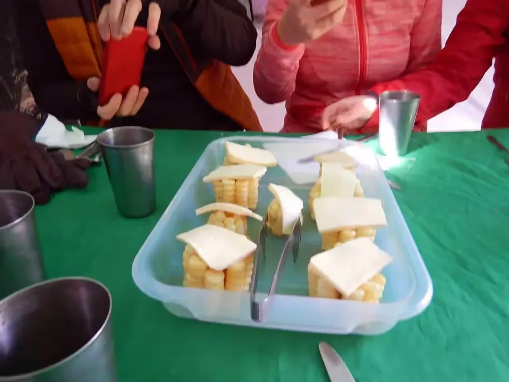 Lunch was served in a simple dining tent. The meal featured corn, cheese, and a refreshing salad with beans – delicious but deceptively filling. As we learned later, overeating during lunch wasn’t a good idea, as the afternoon trek demanded even more effort.